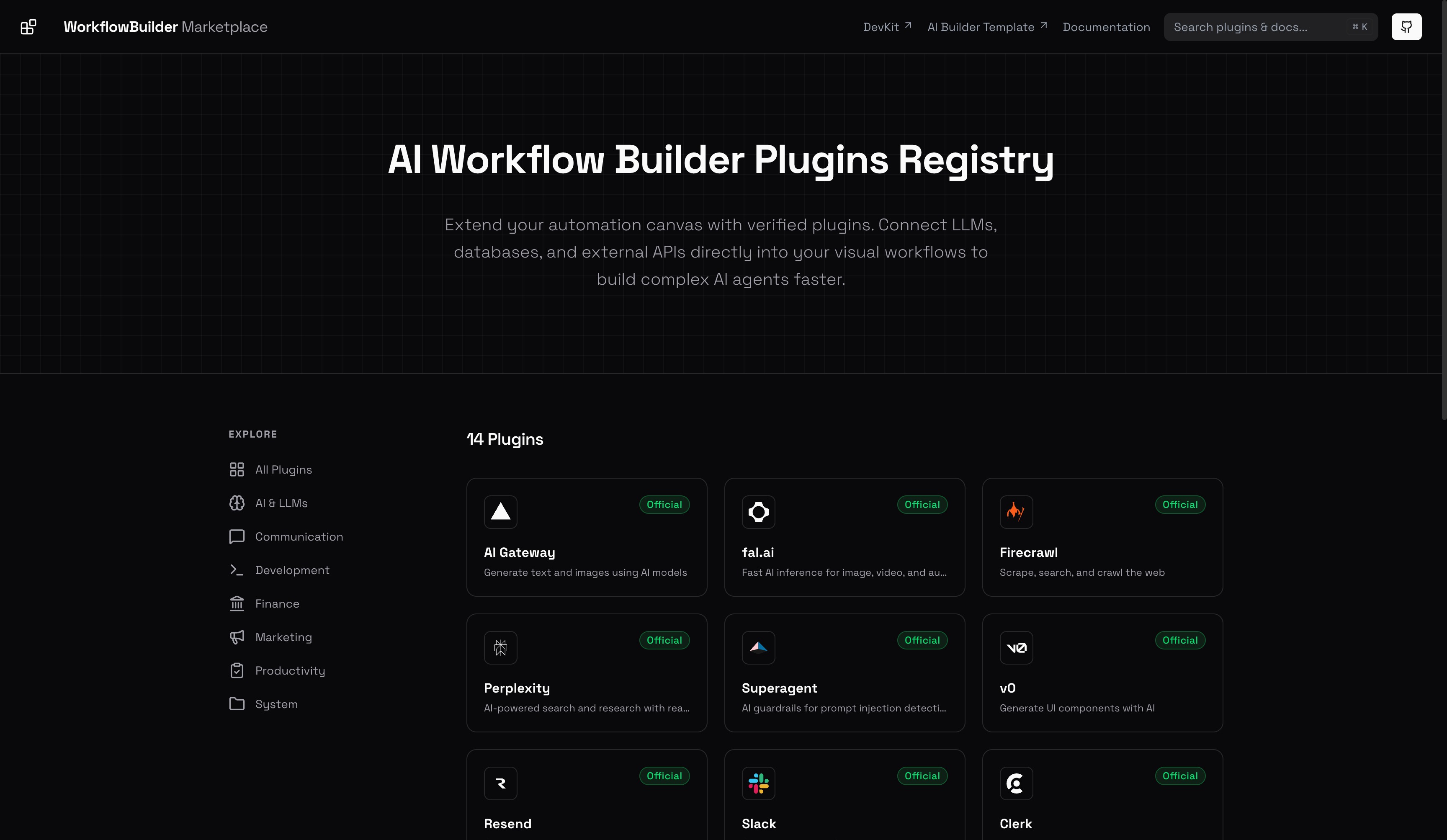 A plugin registry to extend automation workflows with verified integrations. Connect LLMs, databases, and external APIs directly into your visual workflows.